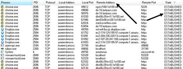 Basically, it’s showing you all the connections from your computer to other computers. On the left side is the process name, which will be the programs running, i.e. Chrome, Dropbox, etc. The only other columns we need to look at are Remote Address and State. Go ahead and sort by State column and look at all of them processes listed under ESTABLISHED. Established means there is currently an open connection. Note that the spying software may not always be connected to the remote server, so it’s a good idea to leave this program open and monitor for any new processes that may show up under the established state.
